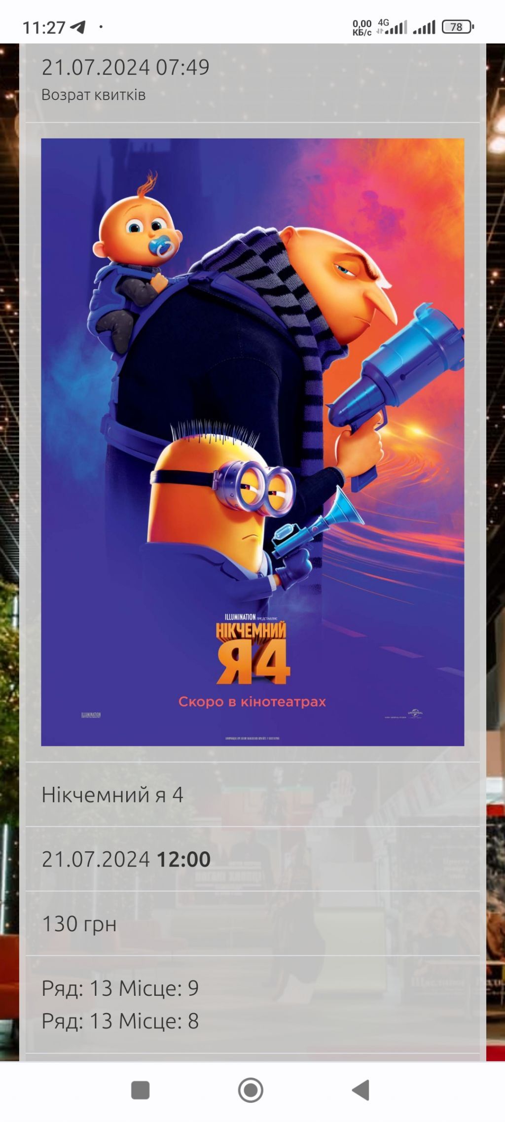Придбала квиток онлайн за 75 грн. Під час перегляду фільму до мене підбіг робітник Мост Сіті кіно на ім'я Владислав та вигнав із зали, почав говорити що я купили квиток для інвалідів. Квиток я замовляла онлайн і такої позначки там не було. Не було її і коли я показала Владиславу застосунок за яким я купувала білети. Владислав почав казати, що я маю придбати зараз ще один квиток. На те щоб доказати Владиславу що в застосунку немає позначки " місте для інваліду" я витратила 15 хвилин, і пропустила частину фільму. І ще мала купити ще один квиток. Настрій був зіпсований.