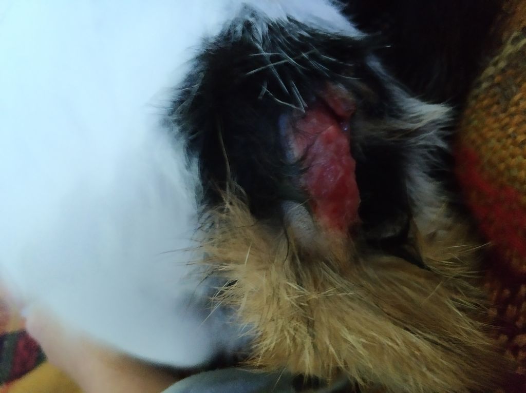 Рана на самом основании хвоста...выстригли шерстку вокруг раны, почистили, обработали, сделали новокаиновую блокаду вокруг раны, наложили повязку, укололи антибиотик, укололи препарат, который ввел животное в состояние обездвиживания...