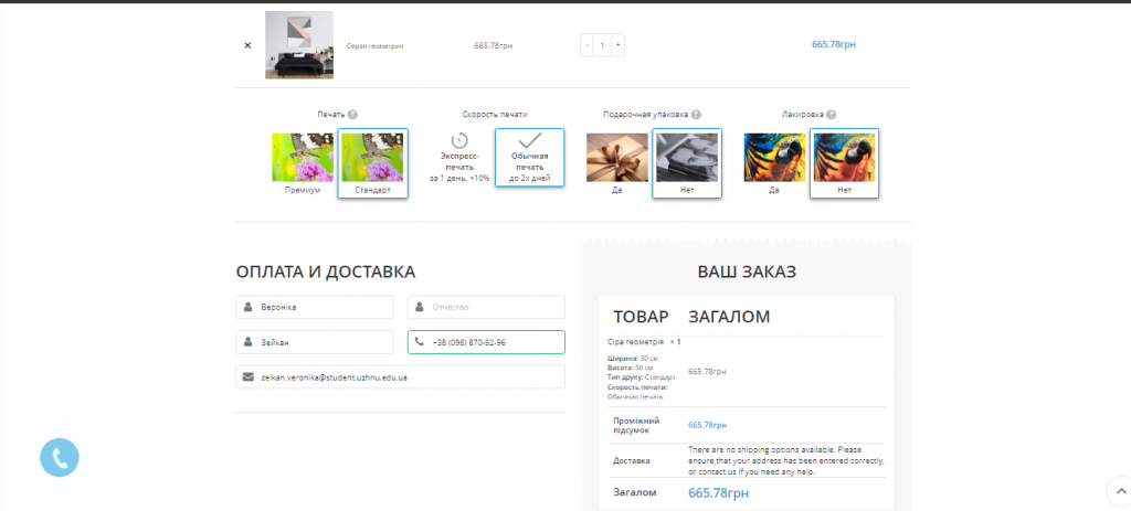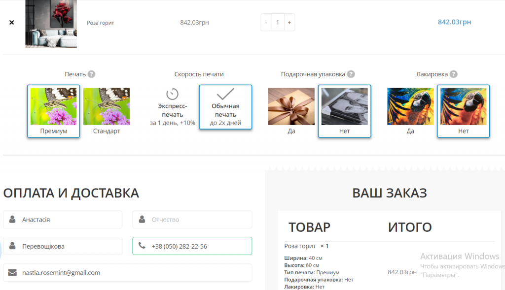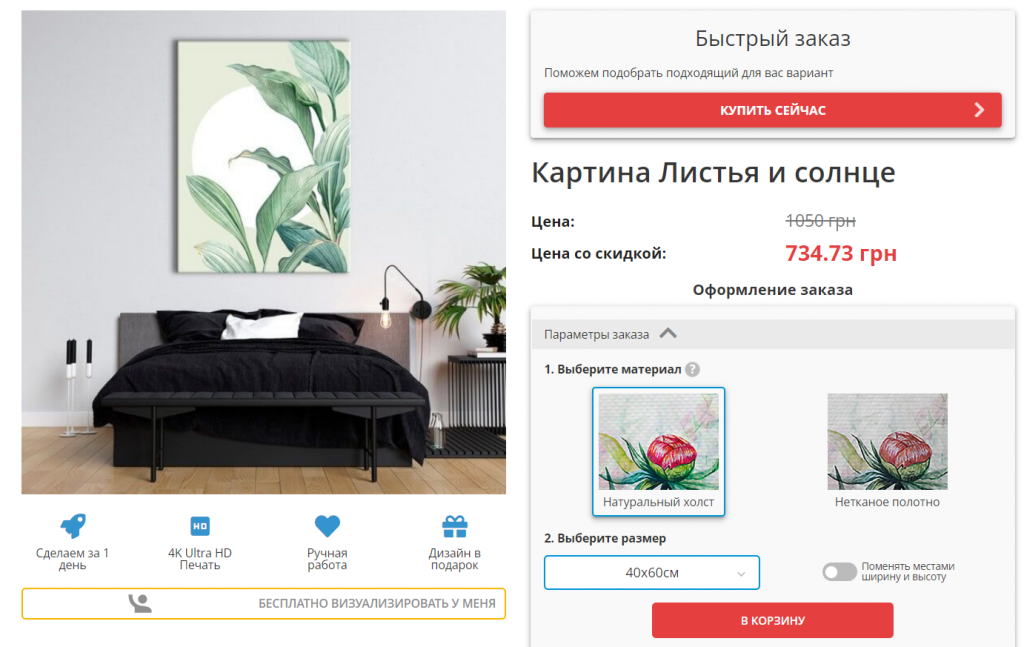 Заказала картину с растением, очень оосвежает интерьер. Понравилось, что можно выбрать практически любой размер, от 20х20 см до почти двух метров)) Мне как раз подошла 40х60, нужно было что-то повесить на стене между креслами. Поскольку была акция, я выбрала натуральных холст, хотя полотно, конечно, было бы дешевле. При оформлении заказа потом можно выбирать вид печати и добавить лакировку, но у меня нет яркого света в комнате, так что взяла самый простой вариант. Для моего размера со скидкой вышло 735 грн. Понравилось, что заказ оформляется очень быстро и не нужна дополнительная регистрация перед этим. Ребята связались сразу, картину отправили согласно срокам. В целом, очень довольна. Если нужно украсить помещение, идеально подходит. Позже думаю еще взять, выбор картин очень большой + разные размеры на любой интерьер и кошелек.