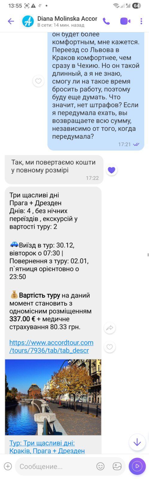 Не пораджу навіть ворогові! Туроператор брехав із самого початку продажу і її брехня стосувалася абсолютно всього! Перед тим, як я віддала гроші, запевняла, що не мають штрафів і гроші повернуть, навіть якщо я відмовлюся в останній момент. Якщо вдасться вставити тут скрін листування, зараз вставлю. Потім вона запевняла, що тур легкий, повернення до готелю не пізніше 10 вечора, за фактом було на 3 години ночі. І третє, готель буде у межах міста, можна доїхати іншим транспортом. Я погодилася лише на цих умовах. Про те, як називається готель, мовчала до останнього. Коли зателефонував гід і назвав готель, виявилося, що він за 20 км від Прагі. Коли я відразу ж вирішила повернути гроші і не їхати, тому що вже був дуже сумний досвід подорожі автобусом і я дуже боялася, що тур буде важкий, а в мене слабке здоров'я, вона відмовилася повертати гроші, посилаючись на те, що я все вигадую. Довелося їхати, хоча вже розуміла, що швидше за все вона брехала у всьому. Так і вийшло. Зіпсовані нерви, зіпсоване здоров'я та зіпсований новий рік! Ви, звичайно, можете видалити мій відгук, але я напишу його на інших сайтах.