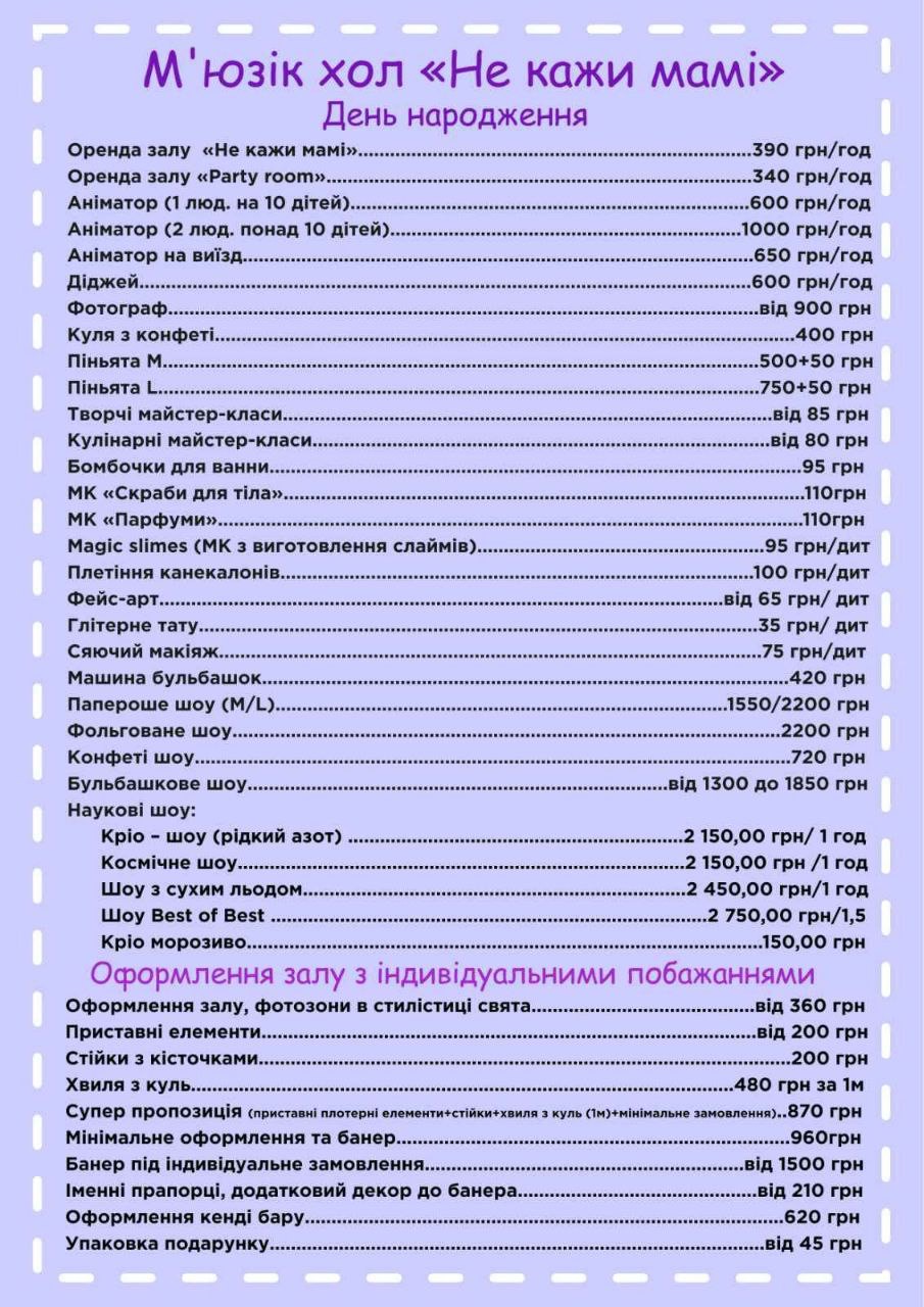 Святкувати день народження можна у мьюзік-холі центру з досить кумедною назвою - “НЕ КАЖИ МАМІ”. Для того, аби все пройшло на гідному рівні, для вас готові працювати кращі аніматори з унікальними шоу-програмами, які розраховані абсолютно для будь-якого віку. Всі ігри рухливі та інтелектуально-розважальні. У холі вам влаштують гучну дискотеку, караоке та неонове party, також є вибухові конфеті шоу, паперове шоу, мильні бульбашки і таємниче “Х-шоу”. Аніматори проводять корисні майстер-класи залежно від уподобань вашої дитини. У “Чорничому кафе” досить цікаве меню, адже є досить кумедні розділи, на кшталт: “Коли я з мамою” з акцентом на корисні страви , “Коли я з татом” з дитячим фастфудом. Дитяче меню включає страви з казковою презентацією, яка обов’язково сподобається малечі. Можна замовити святковий торт. Також у центрі є ігрова кімната з лабіринтом, гральними автоматами та місцем для найменших.
