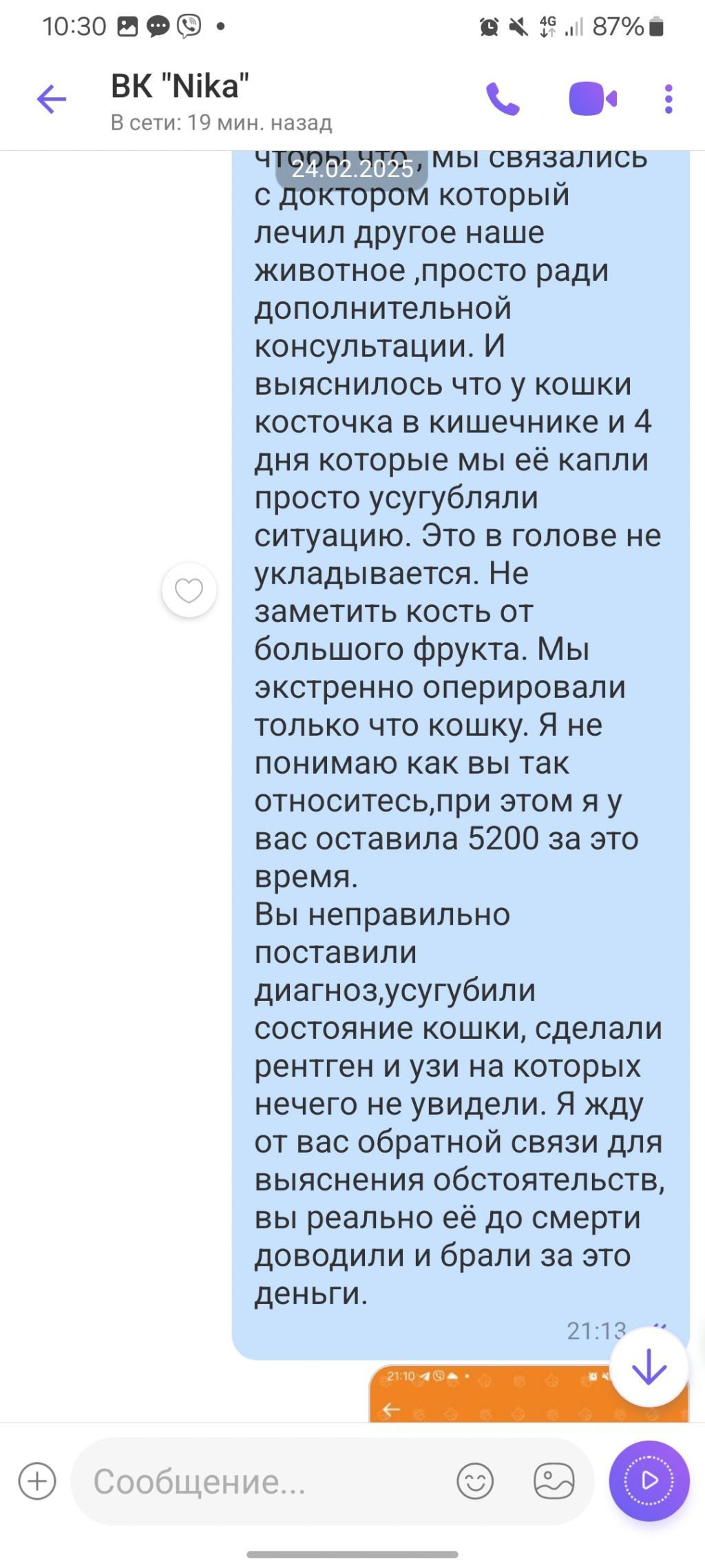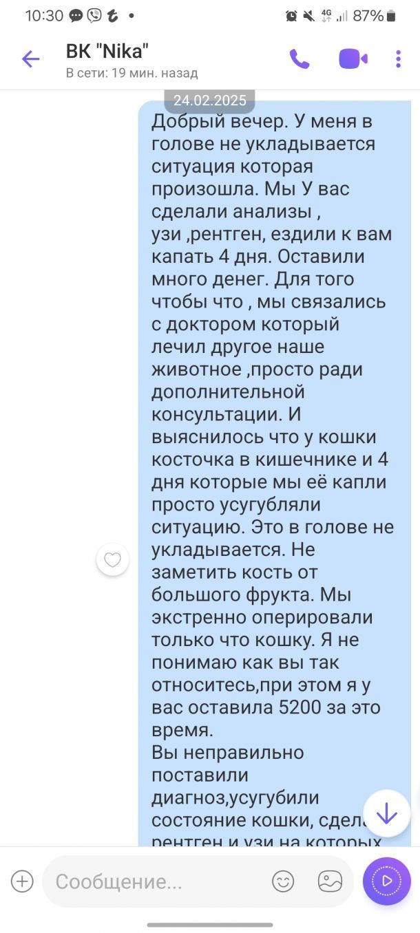 Саме жахливе,що я свою улюбленицю принесла до цих мясників,і вона буднесенька мучались після їх втручання два тижні .І саме головне,що проаналізував всі дії,я впевнена,що операція була зроблена некомпетентно і лікарі пошкодили горлянку чи стравохід моєї красуні і вона просто не могла їсти,хотіла а не могла.Це дуже жахливо розуміти те,що я сама віддала кицю цим лікарям і тим самим обрекла її на страшні муки.Я просто сподівалась,що лікарі намагаються допомогти і вони є людьми