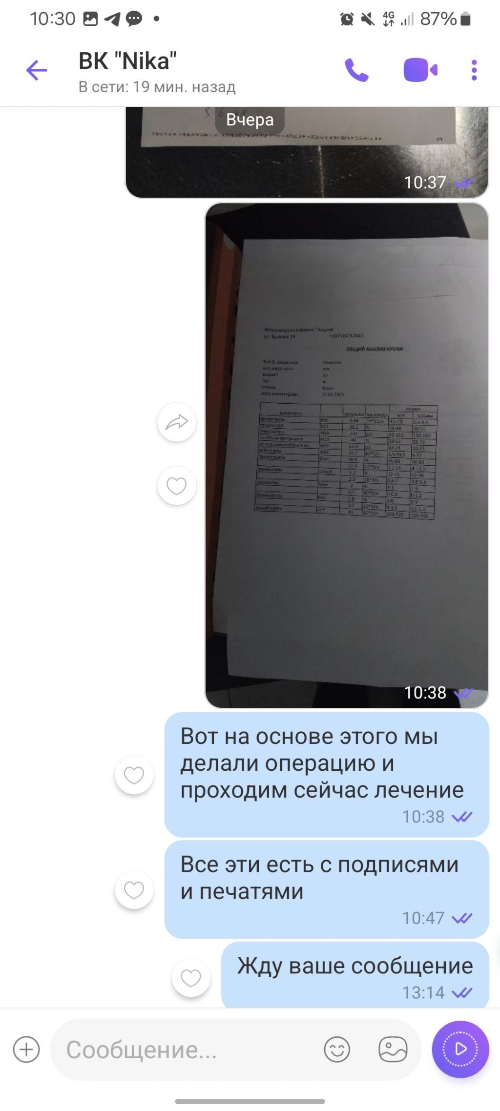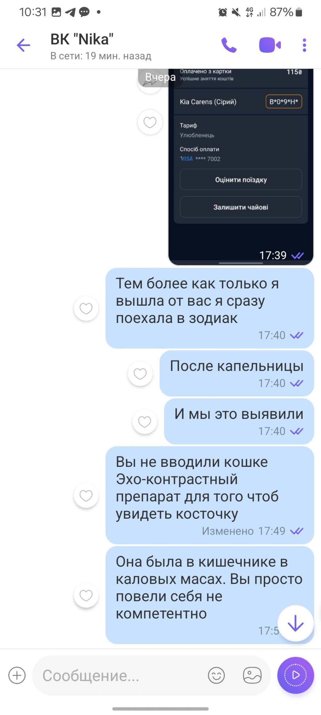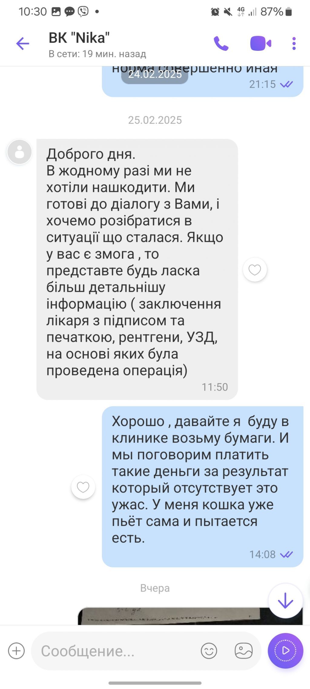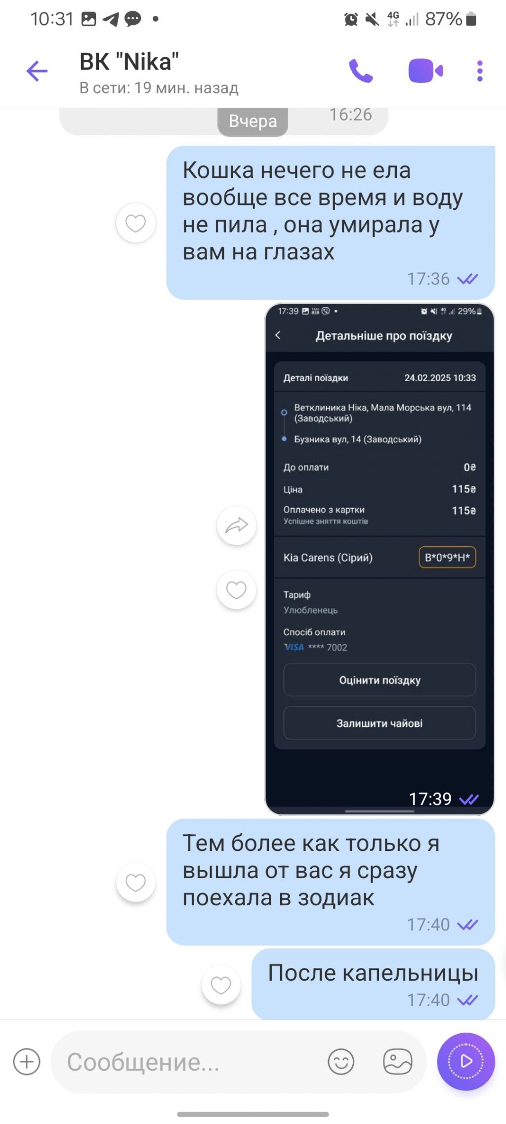 У клініці Ніка за стерилізацію сплатили 1800 грн., потім сплачували за кожний прихід до лікаря протягом двух тижнів, за неякісний підбір ліків, за аналізи, які отримали без жодних коментарів - 1500 грн. Загалом за два тижня "лікування" було сплачено 5000 грн. Діагноз після сдачі аналізів поставили - "стерилізація". Тварина за два тижні втратила біля 2 кг, лікування було неякісне. Ніякої післяопераційної підтримки, незважаючи на помилки лікара.