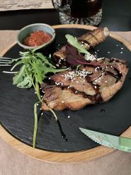 Свинячі вушка просто космос, бастурма з присмаком вершкового масла/маргарину. Салат із телятиною 9/10. Сковорідка з наши...