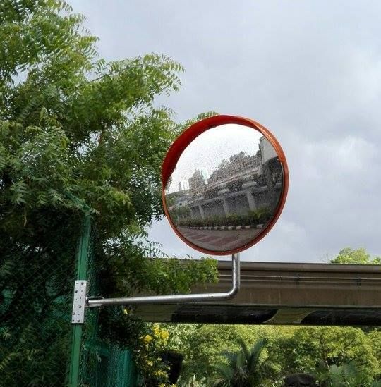 У нашому котеджем містечку є досить небезпечний поворот. Щоб збільшити видимість вирішили купити сферичне дзеркало для дороги. Купили, встановили - тепер наші водії задоволені.