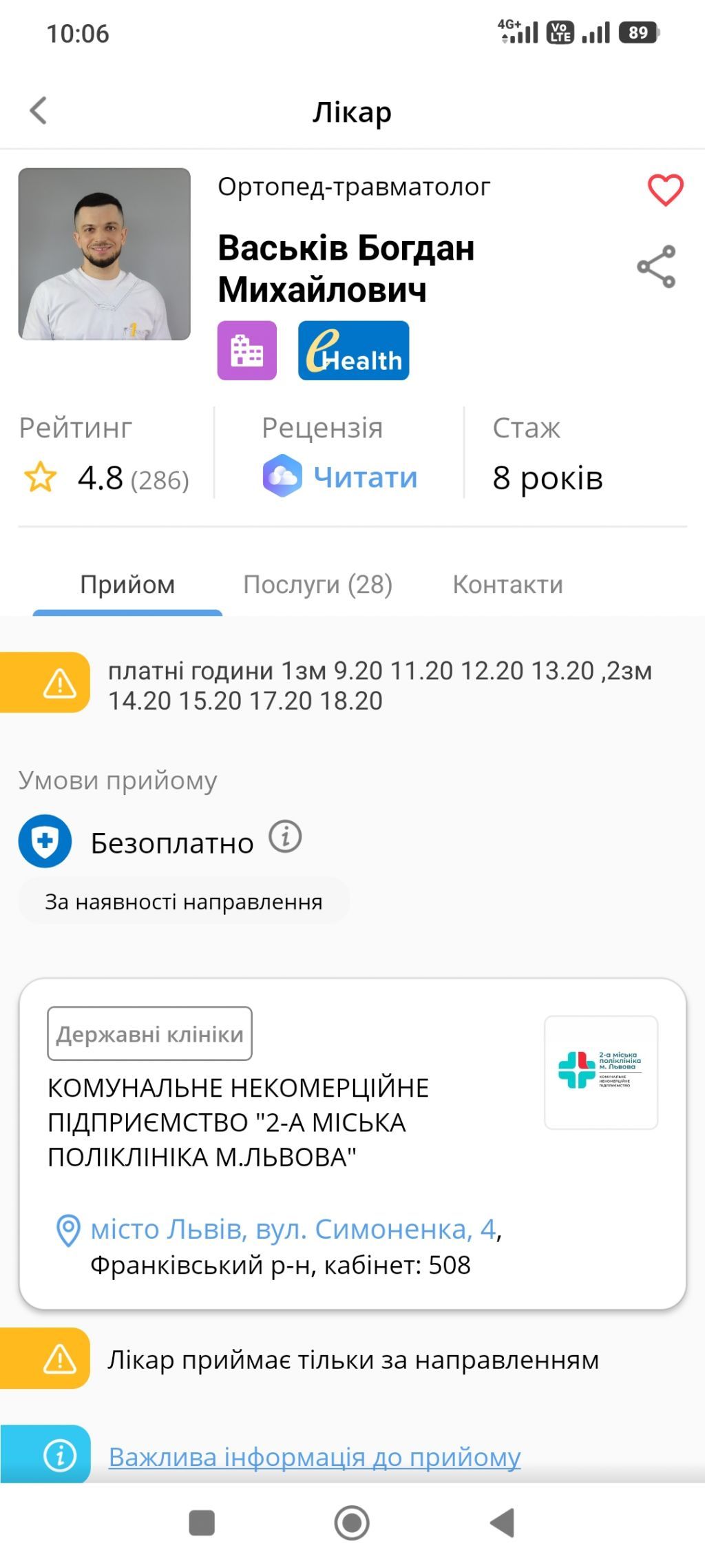 Коммунальная 2-я городская поликлиника во Львове предоставляет услуги широкого профиля, заключая декларации с врачами для дальнейшего ведения пациентов. Услуги включают семейного врача, терапевта, педиатра, стоматолога, гастроэнтеролога, ЛОР, хирурга, невропатолога, кардиолога, уролога, гинеколога, проктолога, физиотерапевта, травматолога и ортопеда. Предоставляется услуга дневного стационара и сп ... Читать дальше