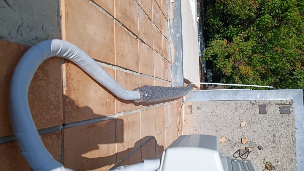 -Магистраль с улицы не закреплена по всей длине (ни одним крепежом), там более 2,5 метров гуляющей на ветру прямой трассы (на 5 этаже сильные порывы ветра). Наружный блок из-за особенностей монтажа, пришлось крепить под верх крыши 5 этажа.