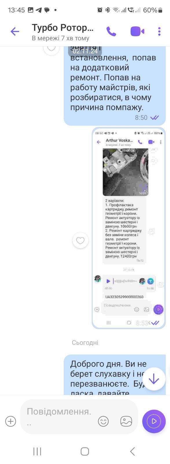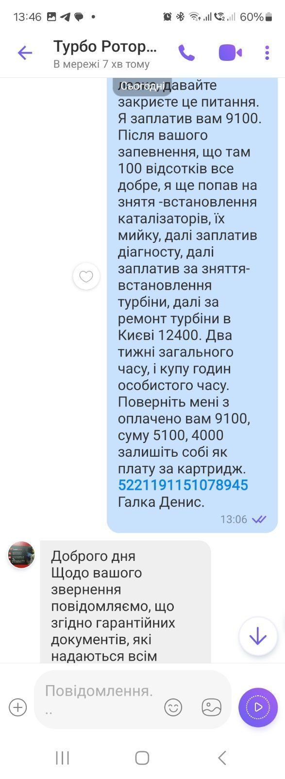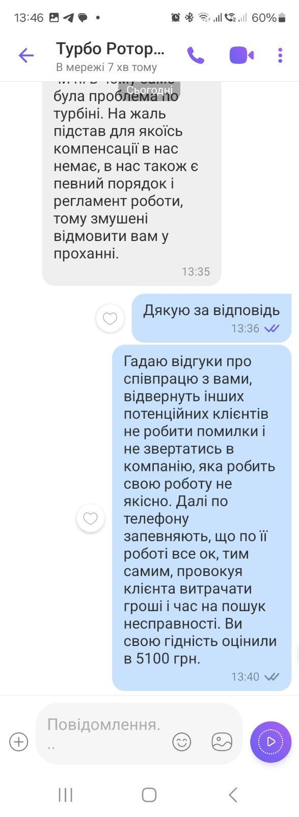 Категорично не рекомендую, гарно "співають", коли все добре, а коли проблема, то з твого номера не беруть слухалку, прийшлось з іншого перезвонювати. Зробили турбіну за 9100, в машини "помпаж". По телефону запевнили, що по їхної работі все добре, після цього потратив два тижні часу, купу грощей, і коли вже все виключили, відправили цю турбіну на інший сервіс, там заплатили 12400, і питання було вирішине. Попросив компенсувати 5100. Довгий час морозились від мене, не казавши ні да ні ні, тримаючи мене в напрузі. І вже коли дозвонився до них з іншого номера - відмовили виплатити будь- яку компенсацію.