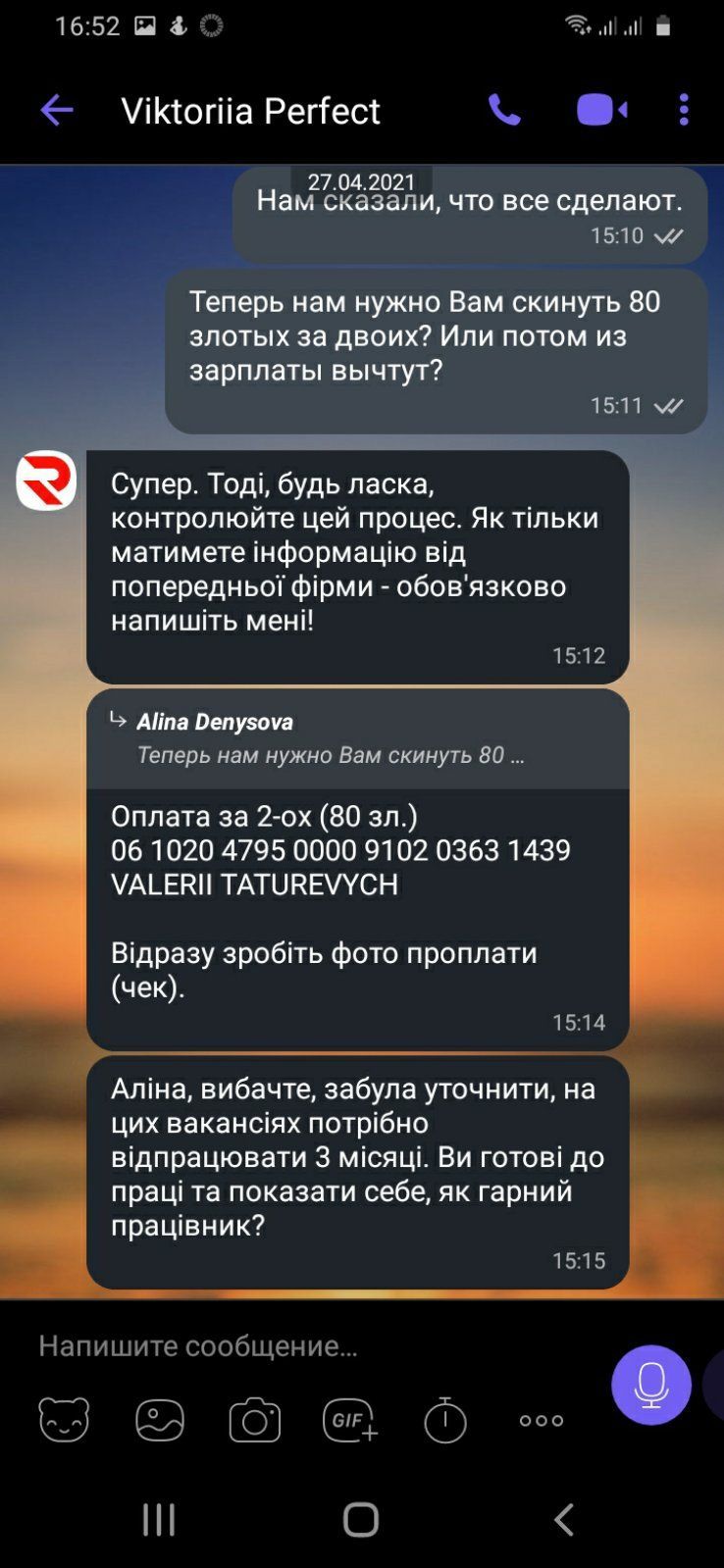Фирма отвратительно подходит к своей работе, по первых берут деньги за приглашение ,а потом в случае чего не хотят возвращать.Именно такой случай произошёл с нами,рекрутер Виктория попросила скинуть им 80 зл за приглашение ,а потом неделю кормила завтраками по поводу возврата ,мол шеф должен Вам скинуть ,потом он поехал на отдых в Европу ,потом пишет что уже перевели ,вообщем смех а не фирма .Лучше с ней не связываться